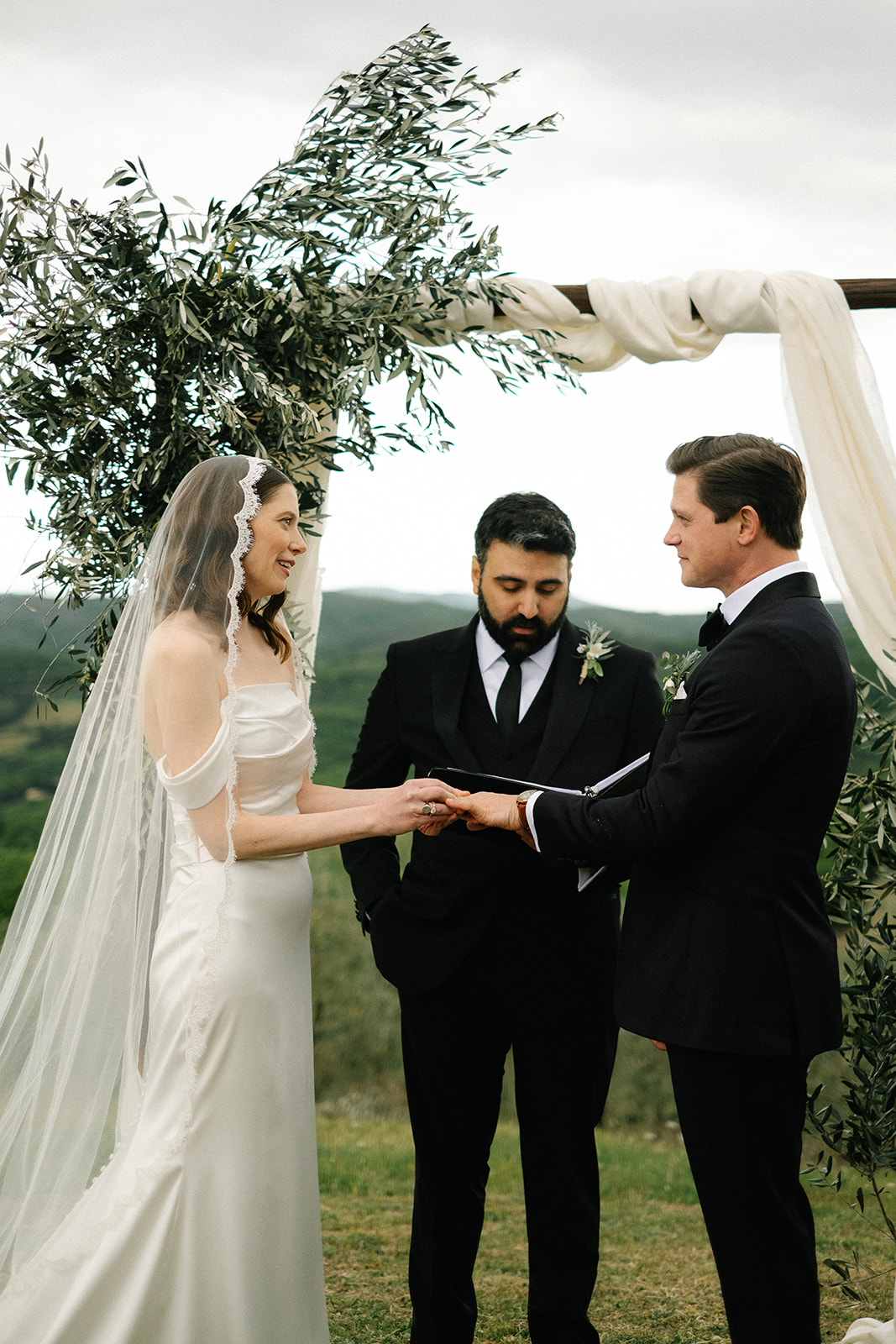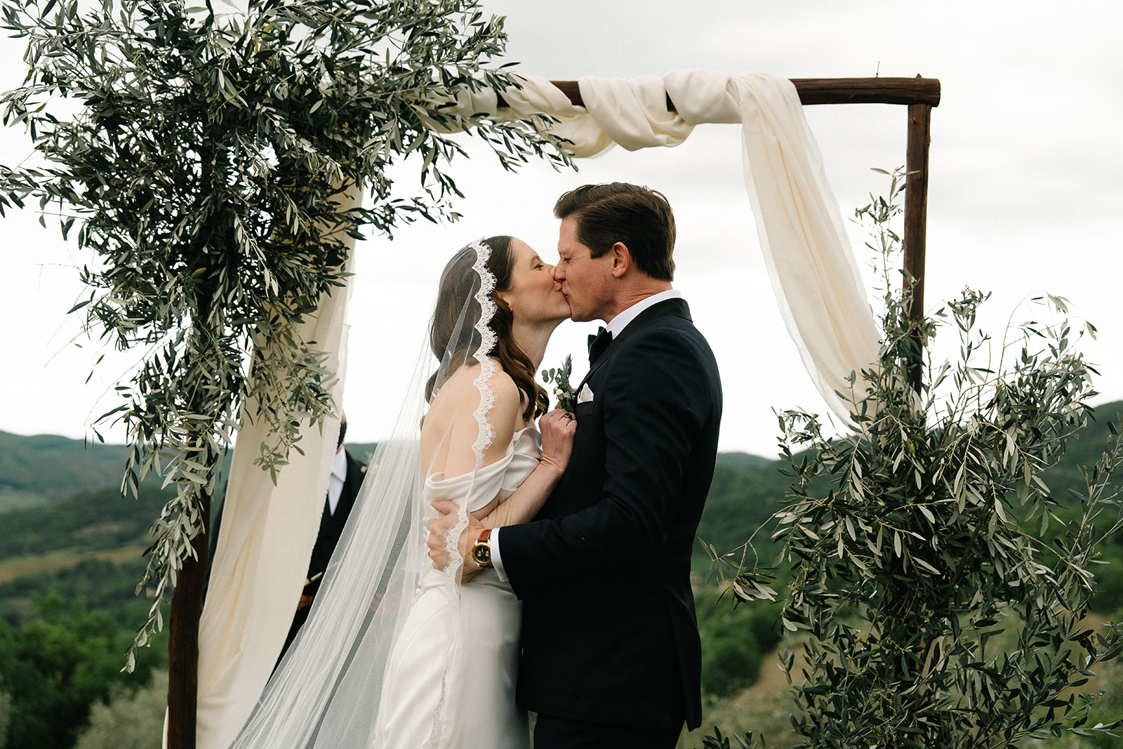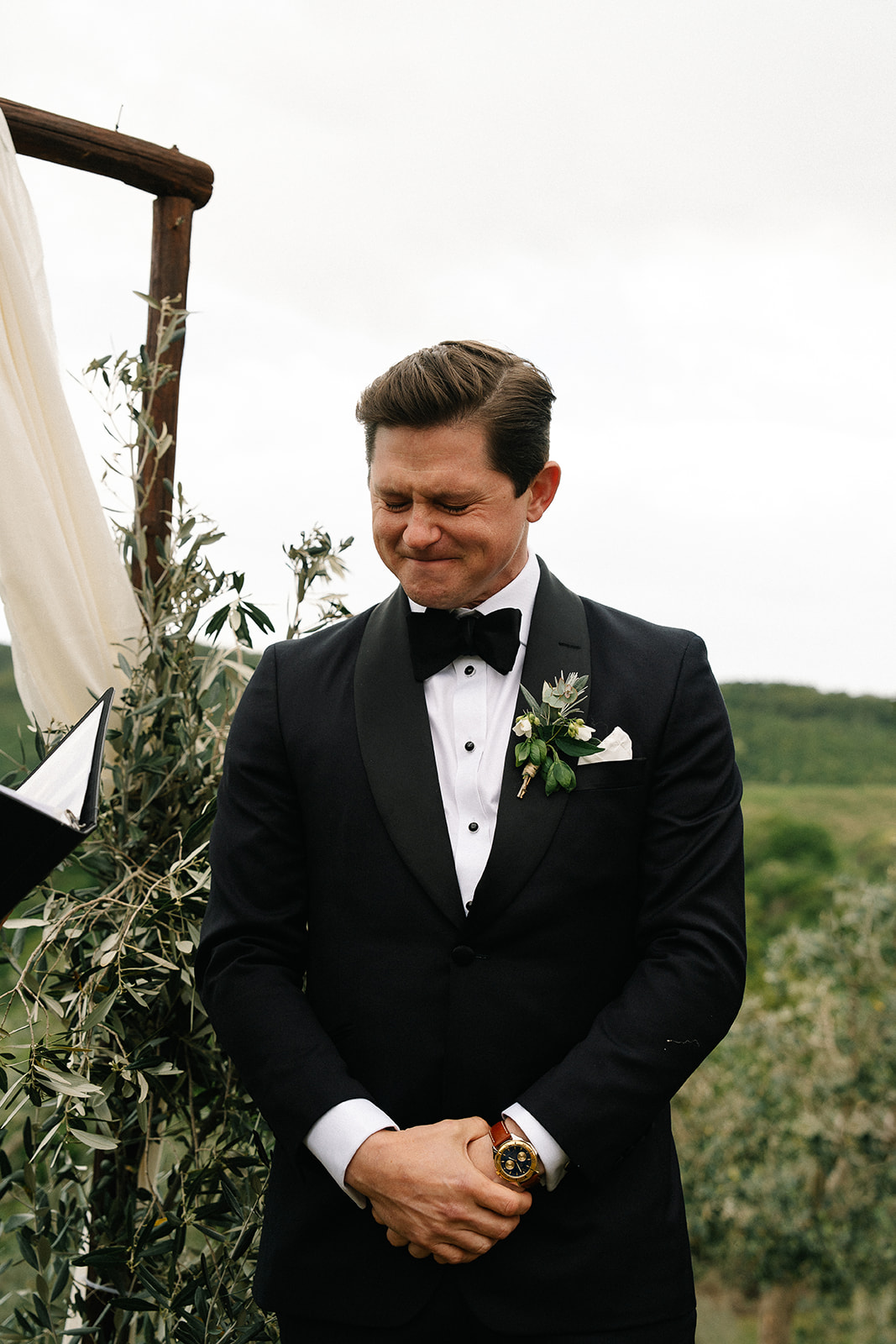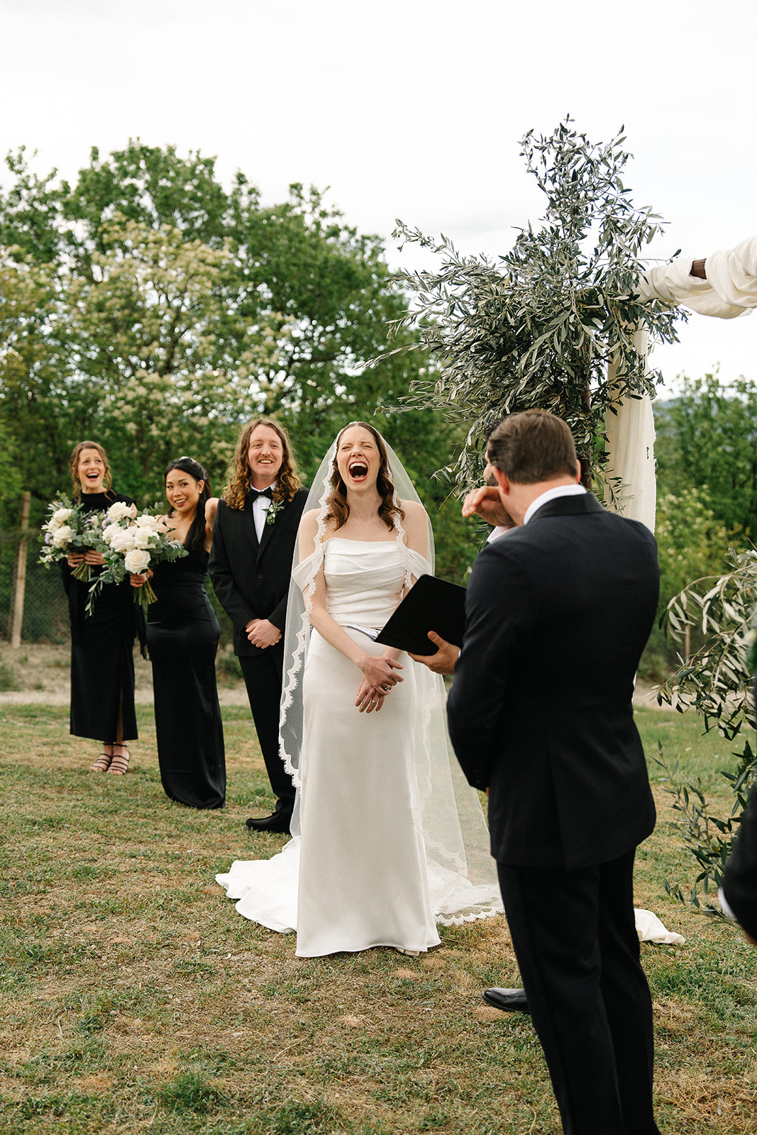The ceremony took place in the Olive Groves, with the lush trees providing a serene and intimate setting. Despite the cloudy weather, the soft, diffused light created a romantic and ethereal atmosphere. Luisa Gorvasi of Bloom crafted beautiful floral arrangements that perfectly complemented the natural beauty of the surroundings, adding vibrant splashes of color to the serene landscape.